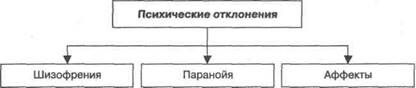 По степени проявления психические расстройства можно условно подразделить на неврозы и психозы. Неврозы представляют собой слабую форму девиации. Например, фобии (воды, высоты, замкнутого пространства), агрессии (вызывающее, угрожающее поведение), де­прессии (безучастное, безактивное состояние). Невротическая личность, безусловно, девиант, но она еще может функционировать в обществе. Невротик, несмотря на некоторые отклонения в поведении, может ра­ботать, жить в семье, общаться в кругу знакомых и незнакомых людей. Более сильную и социально опасную форму девиации представляют собой психозы. Они могут проявляться в различных формах.