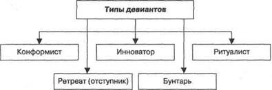 Р. Мертон развивал теорию аномии Э. Дюркгейма. Он считал при- чиной девиантного поведения разрыв между ценностями, диктуемы- ми людям обществом, и социально одобряемыми, институционали­зированными средствами их достижения. В результате этого разрыва нарушается равновесие между жизненными целями людей (например, общественное признание, успех, богатство) и допустимыми средствами их достижения. Появляются люди-девианты, прокладывающие путь к цели другими, не одобренными обществом средствами. Р. Мертон различал пять видов девиантов (схема 5.5).