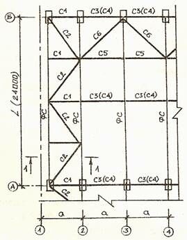 В зданиях типа А – б – II, в которых вертикальные связи между колоннами устраиваются на всю высоту колонн, ветровые усилия передаются покрытием на колонны лишь в узлах крепления стропильных конструкций к колоннам связевой панели. В этом случае необходимо устраивать дополнительные связи в покрытии. Так, при небольшой высоте стропильных конструкций на опоре между колоннами каждого продольного ряда устанавливают распорки, передающие ветровые нагрузки на вертикальные связи. Крепление каждой из стропильных конструкций к колоннам будет при этом работать лишь на приходящуюся на него часть общей ветровой нагрузки. А при значительной высоте стропильных конструкций на опоре (стальные и железобетонные фермы с параллельными поясами, железобетонные безраскосные фермы и т.п.) следует устанавливать вертикальные связи (С1) между опорными стойками ферм в крайних шагах температурного блока, соединяемые непрерывной цепью распорок. Стальные стропильные фермы дополнительно развязываются по нижним поясам раскосами (С2) и крепятся к остальным фермам с помощью растяжек по нижнему поясу (С3) и распорок по верхнему поясу (С4) (рис. 4).