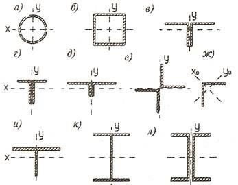 Рис. 11. Типы сечений стальных ферм: а) трубчатые; б) прямоугольное гнутозамкнутое; в,г,д,е) из парных уголков; ж) из одиночных уголков; и) из тавров - для поясов ферм; к,л) то же, из двутавра или двух швеллеров