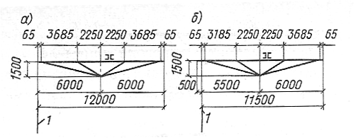 Рис.14. Подстропильные фермы нормальной высоты пролетом 12м: а – рядовые; б – у торца здания