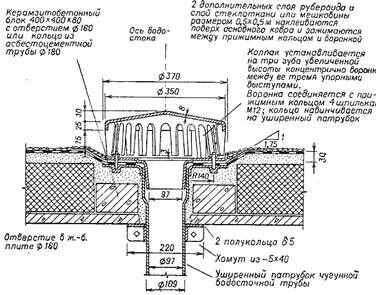 Воронки и патрубки изготавливают из чугуна. В местах отверстий для установки водоприемных воронок основной гидроизоляционный ковер усиливают двумя слоями рубероида и одним слоем стеклоткани на мастике размером 0.5х0.5 м и прижимают специальным кольцом.
