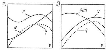 Используемые на практике характеристики лопастных нагнетателей строятся на основании аэродинамических или гидродинамических испытаний. Обычно на одном графике одновременно приводятся кривые напора Н (давления Р), мощности N и к.п.д. (рис. 5.1). Если приведены характеристики, относящиеся к одному диаметру - одному типоразмеру нагнетателя (см. ниже), то они называются индивидуальными. В ряде случаев индивидуальные характеристики представляются для нескольких скоростей вращения (рис.5.2). При подборе нагнетателей наибольший интерес представляют сводные характеристики, когда на одном графике представлены характеристики, относящиеся к разным диаметрам определённого типа (рис.5.3).