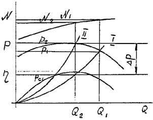 На рис. 8.1 исходной характеристике I соответствует рабочая точка Р1, Q1. В результате дросселирования (увеличения сопротивления сети), характеристика сети приобретает форму II, а рабочая точка – координаты Р2, Q2. При этом давление DРдр=Р2-Р1 теряется в дроссельном устройстве, т.е. для преодоления потерь в сети трубопроводов I используется только давление Рс1. Поэтому к.п.д. установки (вентилятор + дроссель) будет: