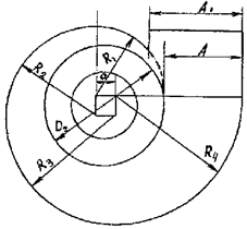 Корпус представляет собой сварную конструкцию из листовой стали, состоящую из спиральной обечайки и плоских боковых стенок. Спиральная стенка вычерчивается способом "конструкторского квадрата" (рис. 9.3). Здесь сторона квадрата а равна 1/4 части "раскрытия" корпуса А. Последнее обычно составляет А=0.6D2.