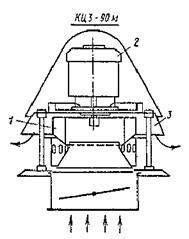 Для установки непосредственно на кровлях зданий применяются крышные вентиляторы; чаще всего они применяются без сети воздуховодов для обеспечения общеобменной вытяжной вентиляции. Схема радиального крышного вентилятора приведена на рис. 9.5, где 1 - рабочее колесо, 2 - двигатель, 3 - корпус.