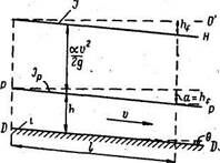 Этот вид движения воды характеризуется схемой, пред­ставленной на рис. 7.1. Здесь напорная линия Н-Н, ли­ния свободной поверхности (она же пьезометрическая ли­ния Р-Р) и линия дна ка­нала D-D являются параллельными прямыми. Следова­тельно, гидравлический уклон J, уклон дна i равны между собой: пьезометрический уклон Jp и уклон дна i равны между собой: