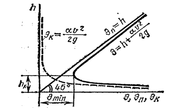 При заданных форме поперечного се­чения русла и расходе удельная энергия сечения являет­ся функцией глубины потока Э=Э(h). Если h→0), то ЭП→0, а Эк→∞ и удельная энергия сечения Э→∞. Если же h→∞, то Эк0, а ЭП→∞и Э→∞. Графически изменение потен­циальной части удельной энергии сечения от глубины по­тока представляется прямой (рис. 6.6), проходящей под углом 45° к оси абсцисс (сплошная линия), а изменение ки­нетической части удельной энергии сечения – гиперболой (штриховая линия). График зависимости Э=ЭП+Эк=Э(h) имеет точку, в которой удельная энергия сечения до­стигает минимума Э=Этiп. Глубина, соответствующая минимальному значению удельной энергии сечения, назы­вается  критической   глубиной.