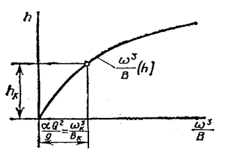 Критическую глубину для русла любой формы попереч­ного сечения можно определить из уравнения (6.14) под­бором или графически. В последнем случае по нескольким произвольным глубинам строится график (рис. 6.7). За­тем, учитывая, что только при критической глубине выпол­няется соотношение (6.14), на оси ω3/B находят значение αQ2/g, которому соответствует искомая глубина hK.