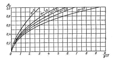 Для   значения Q/b2,5 на оси абсцисс по кри­вой, соответствующей заданному заложению откоса m, на оси ординат находят величину β=hк/b,  по которой вы­числяют критическую глубину