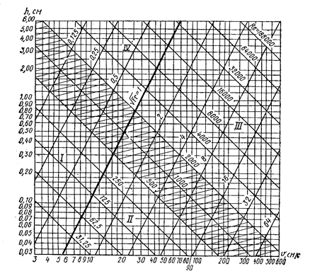 Энергетическое состояние потока в открытом русле, как было показано, определяется соотношениями (6.18)-(6.20). Значение Fr=l, соответствующее критическому сос­тоянию потока, выделено на рис. 6.9 жирной линией. Та­ким образом, линия  и заштрихованная полоса 500<Re<2000 делят график рис. 6.9 на четыре области. Область I соответствует спокойным ламинарным потокам; область II - бурным ламинарным потокам; область III соответствует бурным турбулентным потокам и область IV - спокойным турбулентным потокам.