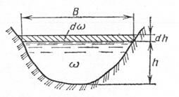 где В — ширина живого сечения по поверхности. Давая глубине h в некотором фиксированном сечении (рис. 6.2) бесконечно малое приращение d h, получаем приращение площади живого сечения d ω= B d h, или