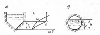Например, для русл замкнутого профиля (рис. 6.3, б) зависимость В=В (h) вначале возрастает, а затем убывает, а для русла составного профиля (рис. 6.3, а) эта зависимость вначале является возрастающей, а при глубинах h>hi ширина В не изменяется.