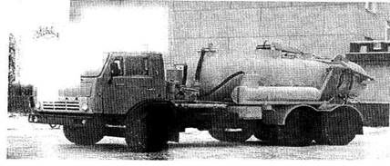 Вакуумная машина (рис. 6, б) предназначена для откачки сточных жидкостей из колодцев или емкостей и транспортировки их к месту утилизации. Специальное оборудование состоит из цистерны, вакуумного насоса с приводом, сигнально-предохранительного устройства, приемного лючка с всасывающим шлангом, краном управления с трубопроводом.