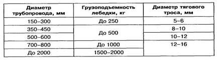 При использовании лебедок необходимо следить за тем, чтобы при разматывании троса на барабане лебедки оставалось не менее четырех витков. Шестерни лебедки должны быть закрыты кожухом. Направлять трос на барабане лебедки рукой категорически запрещается. Для этого необходимо использовать металлический крюк для открывания крышек колодцев. Рукоятки лебедок, если ими в данное время не пользуются, следует снимать. Минимальное тяговое усилие лебедок и тросов подбирают в зависимости от диаметра прочищаемых трубопроводов в соответствии с таблицей 3.2.