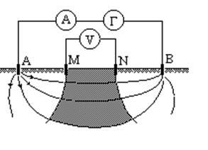 Рис.3.1. Схема четырехэлектродной установки для измерения удельного электрического сопротивления груни ее поле токов. A,B - токовые электроды, M,N - потенциальные электроды, Г - генератор переменного тока.