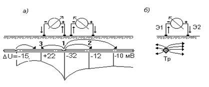 Пусть в результате измерений оказалось, что установка слева на рис.3.2,а  фиксирует DU > 0, т.е. стрелка отклонилась вправо и, следовательно, электрод, подключенный к  зажиму “+”, имеет более положительный потенциал, чем электрод, подключенный к зажиму “-”. Отсюда следует, что между электродами в земле существует ток, направленный от точки 1 к точке 3.