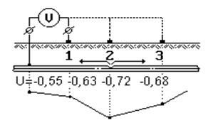 Рис.3.2. Определение местоположения анода коррозионной макропары методом градиента потенциала.