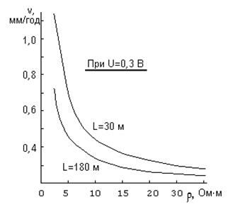 Рис.3.5. Зависимость скорости коррозии от удельного сопротивления грунта для трубопровода диаметром d = 0,2 м c макропарой длиной L и пористостью покрытия sпор= 0,12.