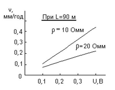 На рис.3.5  приведены искомые зависимости скорости коррозии ( v ) от удельного сопротивления грунта (r ) для достаточно мощных макропар различной протяженности. При этом за длину макропары ( L ) принята длина участка трубопровода между двумя катодами и одним анодом между ними, например, как это показано на рис.3.3,  а величина DU есть предельное изменение потенциала вдоль оси трубопровода, т.е. DU = Umax - Umin , где Umax, Umin - предельные  значения измеренной разности потенциалов труба-земля на исследуемом участке.