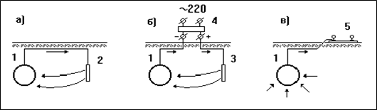 Рис.1.1. Схемы протекторной (а), катодной (б) и электродренажной (в) защиты трубопровода: 1 - трубопровод; 2 - протектор; 3 - анодный заземлитель; 4 - выпрямитель переменного тока; 5 - рельсы электротранспорта.