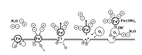 Неуравновешенный ионизированный атом металла Fe+ - до тех пор пока он лишен электрона - является слабым местом решетки. Если этот ион доступен для атаки молекул воды, например, он находится на самой поверхности металла, а лучше - на вершине гребня или неровности поверхности, то вступают в действие электростатические силы притяжения. Окружая ион металла, молекулы воды - в силу своей подвижности - способны расшатать решетку и отделить ион.