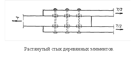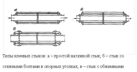 Стык с двойным обжимом перекрывается накладками 1 из полосовой стали, к которым приварены уголки 2. Усилия от растянутых деревянных элементов передаются на стальные накладки через перекрестные болты 3 и 4 и коротыши с нарезкой 5. К стыкуемым элементам приклеивают на концах деревянные накладки 7 со скошенными торцами для упора уголков 6 с таким расчетом, чтобы плоскость скалывания, начинающаяся от уголка, не совпадала с клеевым швом.