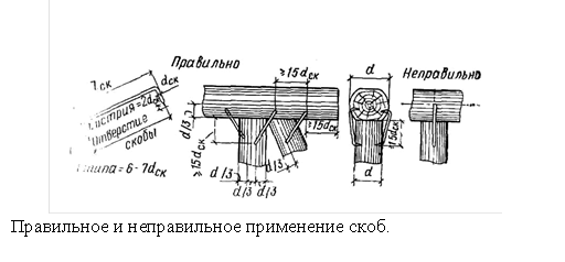 Скобы из круглой (или квадратной) стали толщиной 10-18 мм применяют в качестве вспомогательных растянутых или фиксирующих связей в сооружениях из круглого леса или брусьев, в мостовых опорах, лесах, бревенчатых фермах и т.п. В дощатых деревянных конструкциях скобы не применяют, так как они раскалывают доски. Скобы как правило забивают концами в цельную древесину без сверления гнезд. Несущая способность одной скобы, даже при соблюдении увеличенных норм не определенна.