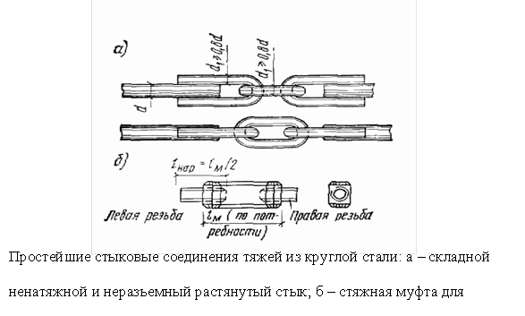 Необходимые лишь в редких случаях натяжные стыки затяжек из круглой стали осуществляют с помощью натяжных муфт с разносторонней резьбой. При отсутствии муфт заводского производства можно изготовить сварные муфты из двух (или лучше 4-х) квадратных гаек левой и правой резьбы, скрепленных на сварке двумя стальными планками.