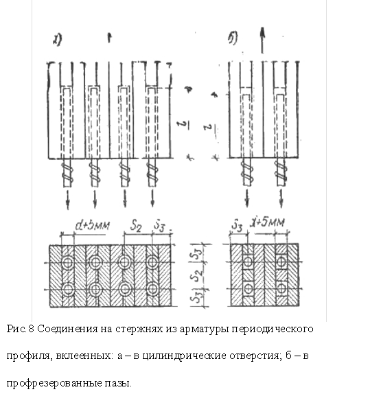 Предварительно очищенные и обезжиренные стержни вклеивают составми на основе эпоксидных смол в просверленные отверстия или в профрезерованные пазы. Диаметры отверстий или размеры пазов следует принимать на 5 мм больше диаметов вклеиваемых стержней.