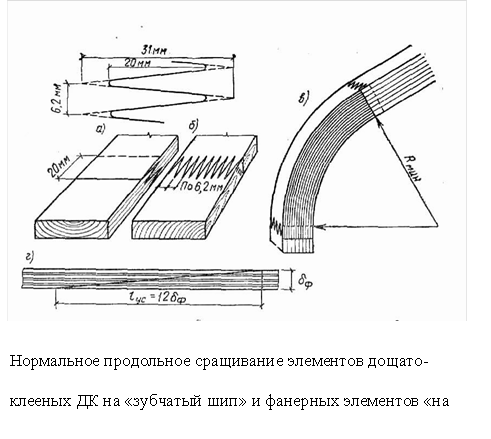 Клеевой шов должен обеспечивать прочность соединения, не уступающую прочности древесины, на скалывание вдоль волокон и на растяжение поперек волокон. Прочность клеевого шва, соответствующую прочности древесины на растяжение вдоль волокон, пока еще не удается получить, поэтому в растянутых стыках площадь склеиваемых поверхностей приходится увеличивать примерно в 10 раз косой срезкой торца на ус или на зубчатый шип.