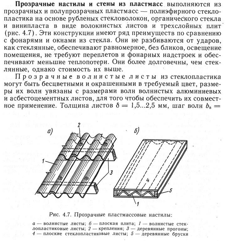 = 60...200 мм, высота волн по осям листа К = 14...54 мм. Волни­стые листы — это готовые элементы неутепленных скатных проз­рачных покрытий зданий, а также прозрачных участков покрытий и стен из волнистых алюминиевых или асбестоцементных листов. Из них также могут устраиваться прозрачные скатные крыши над утепленными чердачными перекрытиями. Волнистые листы укладываются в покрытиях вдоль ската на деревянные или стальные прогоны с уклоном не менее 1:10 и кре­пятся к ним болтами или хомутами, как и асбестоцементные, и стыкуются внахлестку длиной не менее 20 см. Эти листы имеют невысокую прочность и жесткость, поэтому шаг прогонов не должен превышать 1,5 м, а каждый лист должен опираться на два или более прогона, что значительно уменьшает их прогибы.