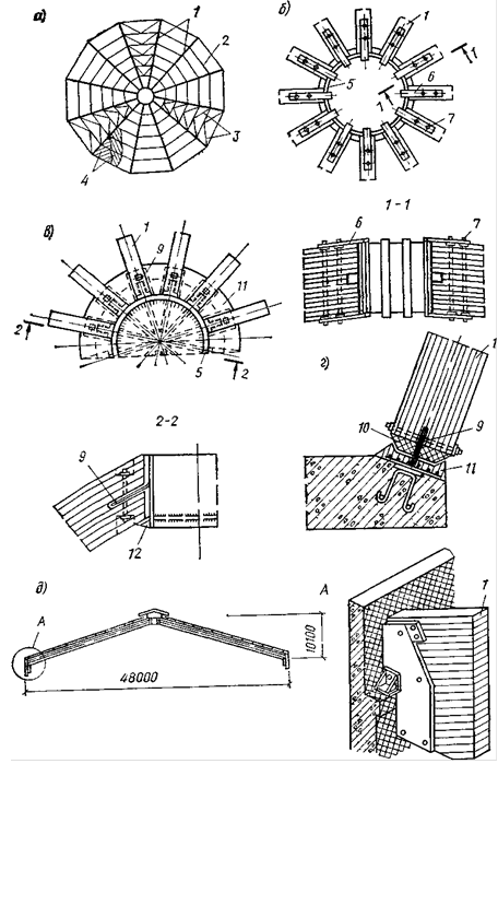 а - схема купола; б в - варианты узлов примыкания ребер к верхнему кольцу; г — узел примы кавия ребер к фундаментам; д - поперечный разрез конического ребристого купола 1- ребро; 2 - прогоны или панели; 3 - скатные связи, 4 - кровля; 5 - верхнее металлическое опорное кольцо, 6 - металлическая планка, 7 - зубчатая шпонка. 8 - ребро жесткости, 9 - пластичный шарнир, 10 - клин из клееной древесины, 11 - полимербетон, 12 - столик опорного кольца