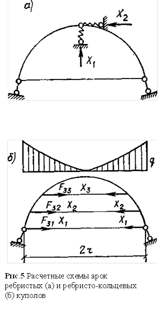 Расчет ребристых куполов на вертикальную симметричную относительно оси купола нагрузку может быть выполнен расчленением покрытия на отдельные плоские арки, каждая из которых воспринимает нагрузку с приходящейся на нее грузовой площади треугольного очертания.