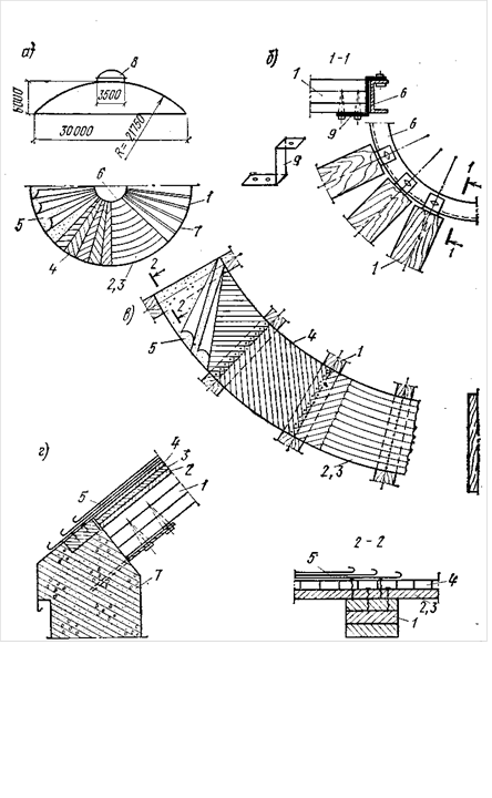 а — поперечный разрез и план; б — примыкание к верхнему опорному кольцу; в — детали покрытия; г — примылание к нижнему опорному кольцу; / — дощатые ребра; 2 — нижний слой кольцевого настила; 3—верхний слой кольцевого настила; 4 — косой настил; 5 — кровля; 6 — верхнее опорное кольцо; 7 — нижнее железобетонное опорное кольцо; 8 — фонарь; 9 — металлическая деталь крепления ребер