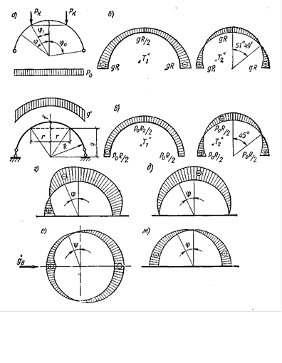 Усилия Т1 и Т2, справедливы для сплошного замкнутого купола. Если в куполе имеется фонарное отверстие и масса фонаря более чем в 1,5 раза отличается от массы вырезанной части купола, то необходимо учесть нагрузку Рк (рис. 3, а), линейно распределенную по краю сечения фонарного выреза