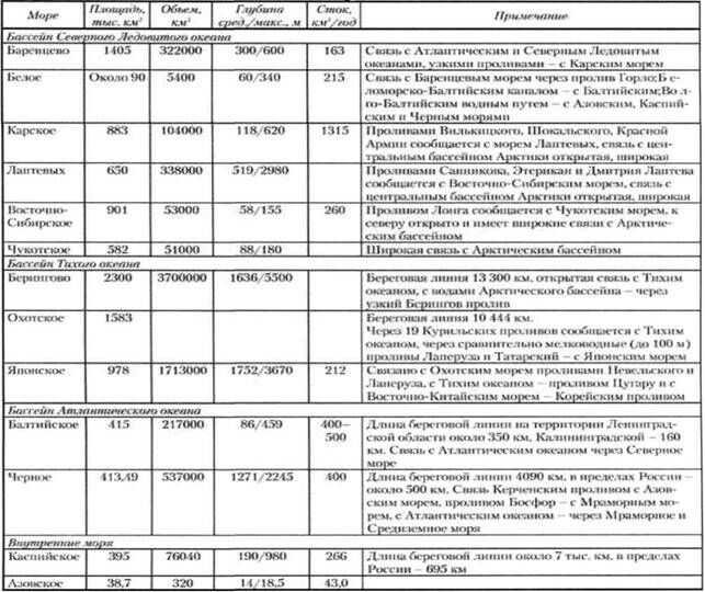 Морские воды. Территория Российской Федерации омывается 13 морями, принадлежащими бассейнам трех океанов: Северного Ледовитого, Тихого и Атлантического, и обладает уникальным водным побережьем протяженностью около 60 тыс. км. Общая площадь морской акватории, попадающей под юрисдикцию России, составляет 7 млн. км2.
