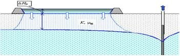 Создание искусственных запасов производится один или несколько раз в году путем единовременного затопления больших площадей вблизи водозаборного сооружения, обычно предварительно производится зачистка слабопроницаемого почвенно-растительного слоя. Полное насыщение пород в зоне аэрации над депрессионной воронкой (Рис. 3) происходит достаточно быстро: