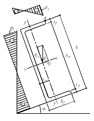 Прогон с сечением из швеллера следует устанавливать стенкой по направлению ската (рис. 3.6), чтобы уравновесить крутящий момент от составляющей qy, приложенной на верхнем поясе.