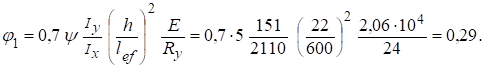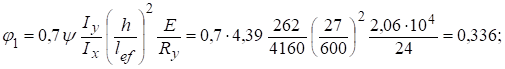 Для определения коэффициента jb предварительно вычисляем коэффициент j1. Для балок двутаврового сечения с двумя осями симметрии он определяется по формуле