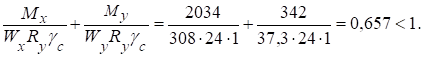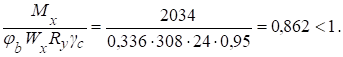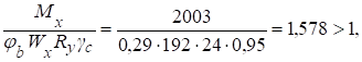 Wx,min = Mx(1 + 7 × 0,167)/(Rygc) = 1904 × 2,17 / (24 × 1) = 172,15 см3.