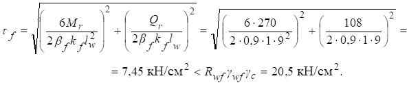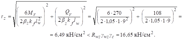где σ = Мr/Wr = 6Мr/(trhr2) = 6 · 270 / (1 · 102) = 16,2 кН/см2;