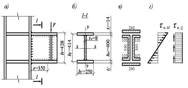 в – расчетные длины швов; г – эпюры напряжений в шве