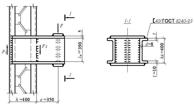 Пример 8.7. Рассчитать прикрепление консоли из двух швеллеров (рис. 8.16). Сталь класса С255. Сварка механизированная (условия сварки – по данным примера 8.6). К консоли приложена расчетная сила F = 600 кН с эксцентриситетом е = 350 мм.