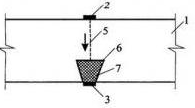 1 - прозвучиваемый элемент; 2 - излучающая пьезоэлектрическая пластинка; 3 - пьезопластинка, воспринимающая колебания; 4 - призма из оргстекла; 5 - направление прозвучивания; 6 - выявляемый дефект, 7 - теневая зона