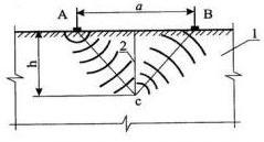 Определение глубины трещин в бетоне. Излучающий и прием­ный преобразователи А и В располагаются симметрично относительно кра­ев трещины на расстоянии а друг от друга (рис.3). Колебания, возбуж­денные в точке А. попадут в точку В по кратчайшему пути: