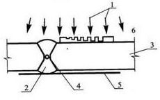 Рис. 1. Выявление дефекта в сварном шве: а - схема просвечивания; 6 - эталон чувствительности (дефектометр); 1 - ионизирующий поток; 2 - наваренный металл шва; 3 - основной металл; 4 - дефект; 5 - фотопленка; 6 - эталон чувствительности