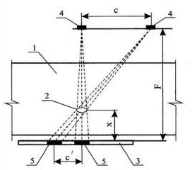 Рис.2. Определение глубины расположения дефекта: 1 - просвечиваемый элемент; 2 - дефект. 3 - фотопленка; 4 и 4' - источник излучения в двух позициях; 5 и 5' - затемненные участки фотопленки; с - смешение источника излучения; с' - смешение центра заснятого изображения, F - фокусное расстояние; х - расстояние от фотопленки до горизонтальной оси дефекта.