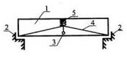 1- изогнутая ось загружаемой конструкции; 2 - рабочее плечо прогибомера. 3 - неподвижное плечо прогибомера; 4 - рычаг; 5 - неподвижные опоры