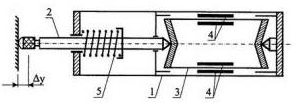 1 – корпус; 2 – рабочий шток; 3 – система преобразования перемещений; 4 – тензосопротивление; 5 – пружина